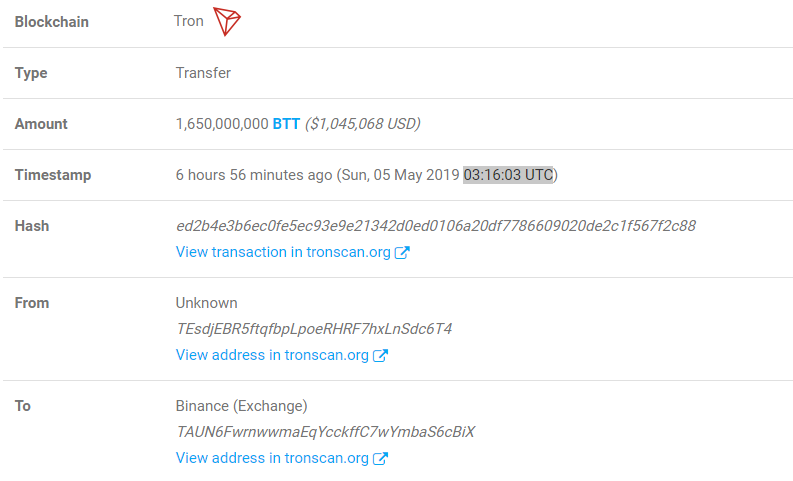 A user transferred BitTorrent Token from an unknown wallet to a wallet on Binance. The user sent 1.65 billion BTT, worth approximately $1.04 million [$1,045,068].