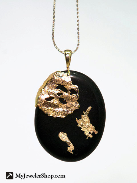 This oval onyx stone has been decorated with 10kt gold which has been worked into a natural flowing appearance. The polished gold creates a striking contrast against the glossy black surface of the onyx. The 10kt gold weighs a total of 2.2 grams. The piece measures 5 x 3 cm