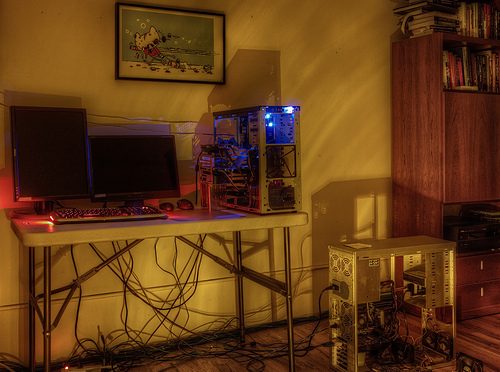 These bitcoin miners have been running almost constantly for a year and a half on Fedora 14. They’re in a minimally temperature controlled space ranging from 35°F-95°F and require some of the video cards to be placed outside of the chassis.