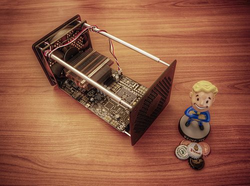 A discontinued 30GH/s bitcoin miner from Butterfly Labs with a Fallout 3 bobblehead for scale.