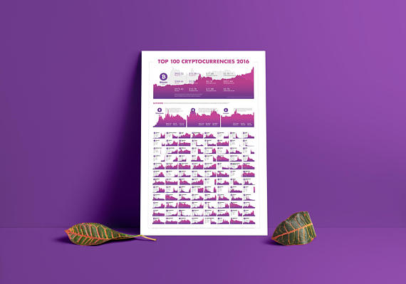 This is a must-have poster for any crypto currency enthusiast. This infographic poster (measuring 24 x 36 inches) shows a historical overview of the top 100 crypto currencies in 2016 with bitcoin, Ethereum, Ripple and Litecoin featured at the top. Each coin shows a historical pricing chart for 2016 alongside data like market capitalization in USD, lowest and highest value in USD. Coins are ranked by market capitalization. More than 3,000 API requests were made from 6 sources to gather all the data. Each logo for each coin has been manually edited for consistency. Start collecting this yearly overview today!