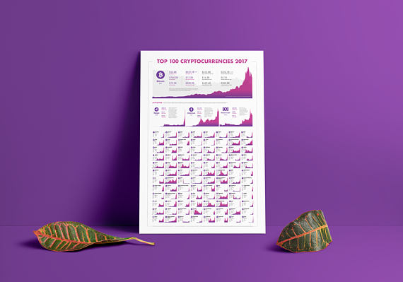 This is a must-have poster for any crypto currency enthusiast. This infographic poster (measuring 24 x 36 inches) shows a historical overview of the top 100 crypto currencies in 2017 with bitcoin, Ripple, Ethereum, bitcoin Cash and Litecoin featured at the top. Each coin shows a historical pricing chart for 2017 alongside data like market capitalization in USD, lowest and highest value in USD. Coins are ranked by market capitalization. More than 3,000 API requests were made from 6 sources to gather all the data. Each logo for each coin has been manually edited for consistency. Start collecting this yearly overview today!