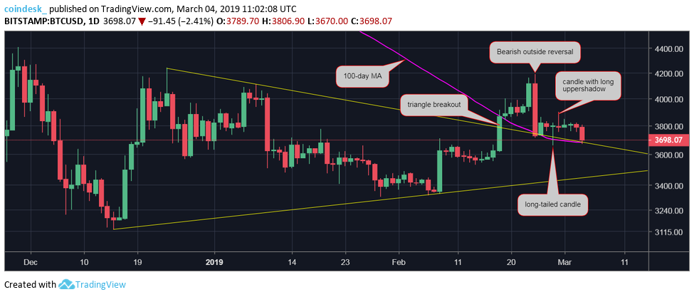 - bitcoin’s drop to six-day lows below $3,700 has taken the shine off the bullish “long-tailed doji” created on Feb. 27. A bearish reversal would be confirmed if prices see a UTC close below $3,658 (low of long-tailed doji) and could yield a sell-off to recent lows near $3,300.