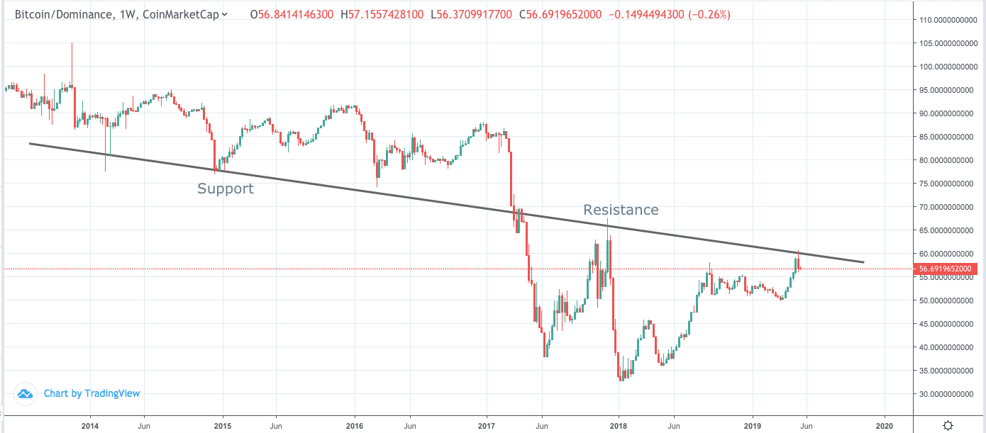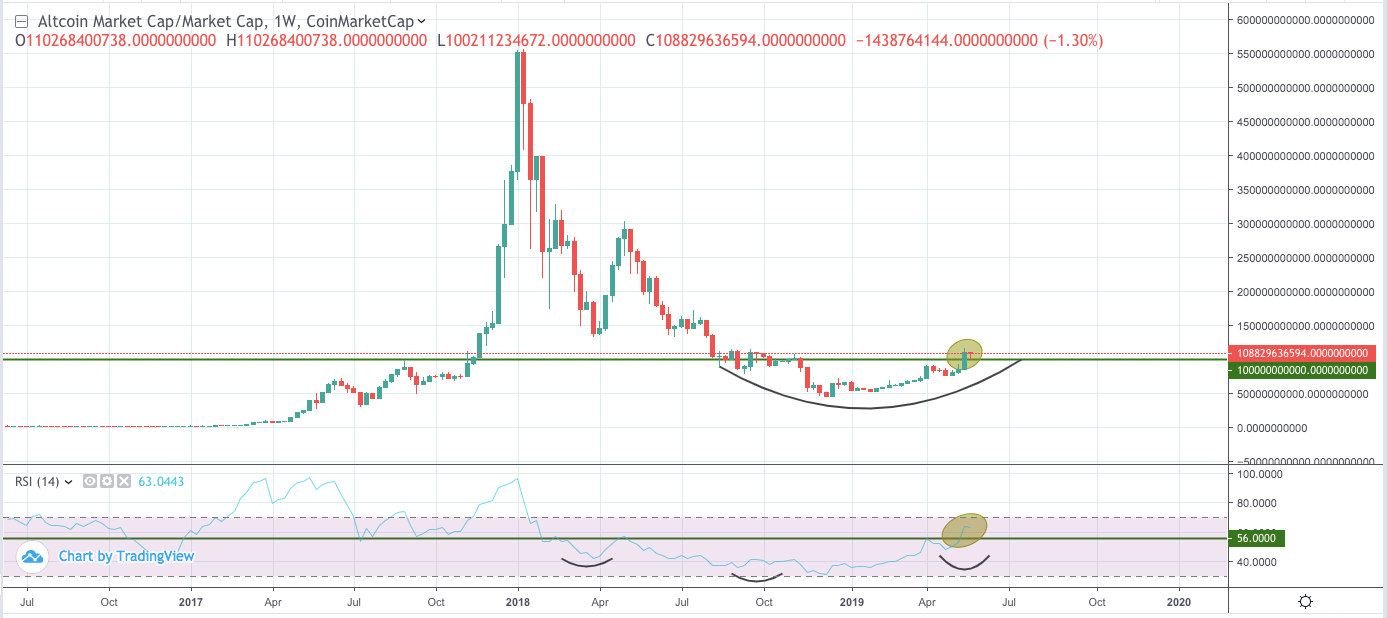 With the bitcoin Dominance Index flashing signs of weakness, the altcoin market cap is looking bullish. It broke out of a rounding bottom pattern on the weekly chart after five months of consolidation when it breached the $100 billion mark on May 15, 2019.