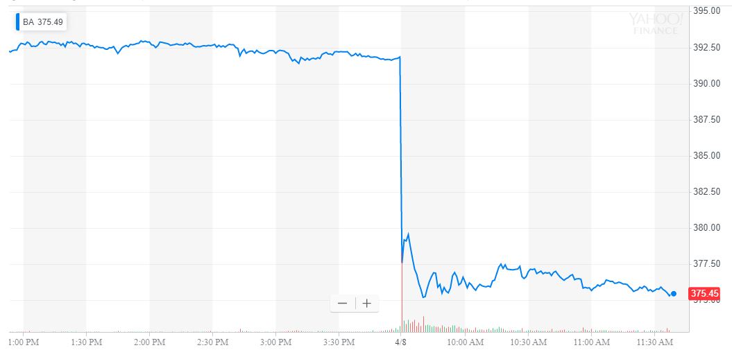 Boeing stock declined more than 4 percent on Monday. Source: Yahoo Finance