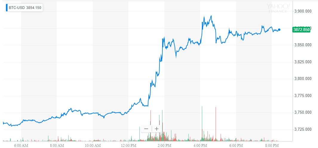 The bitcoin price lagged the overall market but managed to cross $3,800 on all major crypto exchanges. | Source: Yahoo Finance