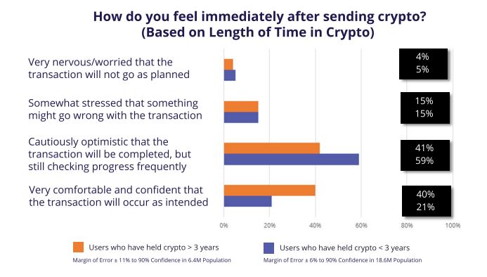 In fact, 60% of newer users failed to answer “very comfortable” when asked how they felt immediately after sending a crypto payment. The number of experienced users who feel “very comfortable” is just shy of the number who answered “cautiously optimistic.” It’s about 79% for users who’ve held crypto for less than three years.