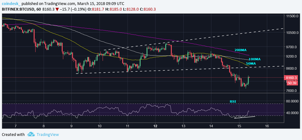 The bullish price-relative strength index (RSI) divergence could push prices higher to $8,700 (hourly 50-MA) and possibly to $9,000 in the next 24 hours.