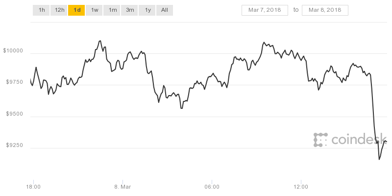 According to CoinDesk’s bitcoin Price Index (), the price hit a low of $9,075.87 before recovering. At press time, the cryptocurrency’s value is hovering around $9,287.00. The development is a notable one, coming roughly a day after the market saw during afternoon trading.