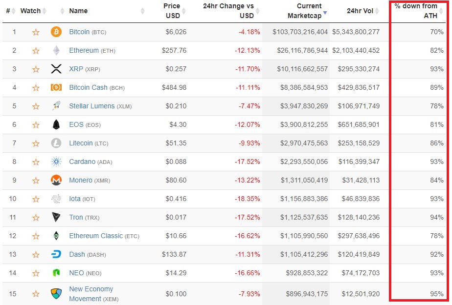 Indeed, as of the time of writing, seven of the 15 largest cryptocurrencies have plunged more than 90 percent from their peaks: ripple, cardano, IOTA, tron, dash, NEO, and NEM. Five others — ethereum, bitcoin cash, EOS, litecoin, and monero — have experienced declines in excess of 80 percent. This leaves just three — bitcoin, stellar, ethereum classic — that have declined less than 80 percent, though bitcoin has nevertheless seen a 70 percent sell-off, and XLM and ETC are both quickly approaching the 80 percent threshold as well.