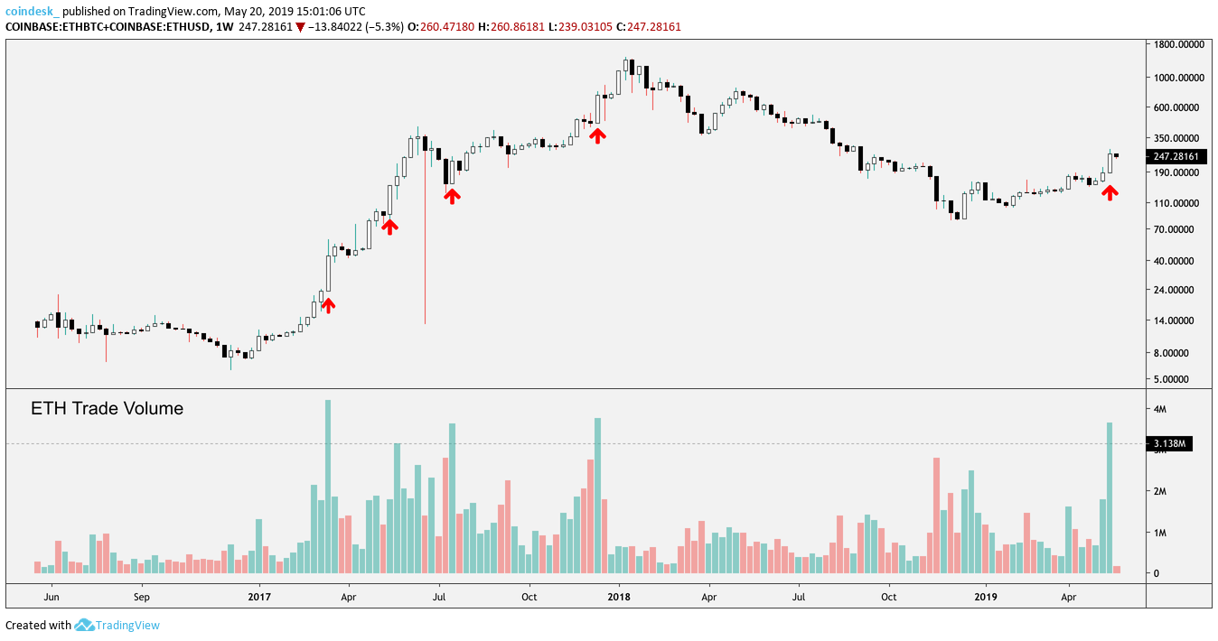 In Coinbase’s two most popular ETH markets, ETH/BTC and ETH/USD, a combined total of 3,675,570 units of ETH changed hands from May 13 to May 19, which at current market prices ($246) has a notional value of over $904.1 million – its highest total in a week since Dec. 11, 2017 according to data from