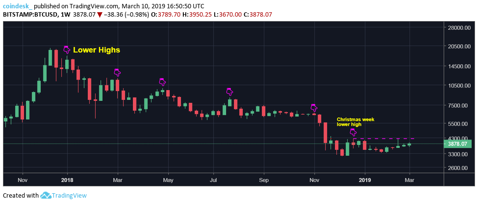 On the weekly chart, BTC has been charting regular bearish lower price highs and lower price lows since January 2018. These were essentially shallow bounces that ended up recharging the engines for a drop to further lows.