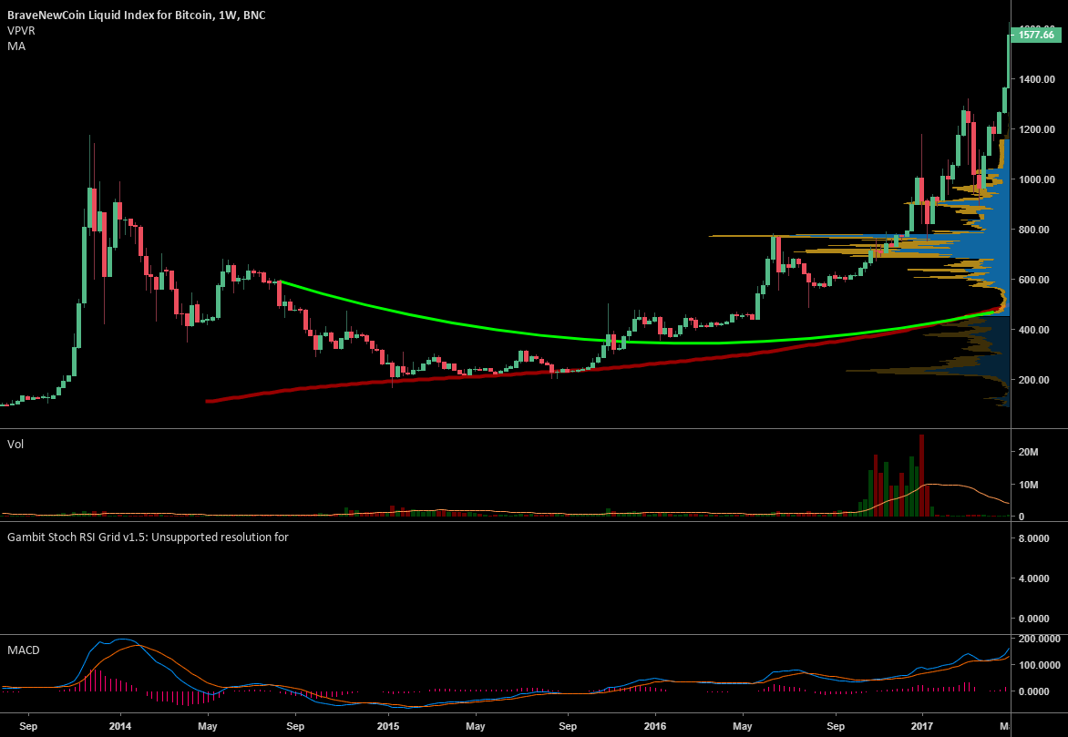 I’ve been looking at the 200 MA on the weekly for a while and i was curious whether it might have some information as to where we’re headed. I’m getting conflicted data from the 2 charting services I use. The green line I drew myself is what’s shown to have happened on the bitcoinwisdom chart of the bitfinex price. The red line is the 200 MA on the Bravenewcoin index as it appears on Trading View. I wanted to do just bitfinex, but the 200 MA on the weekly is even shorter for finex on Trading View.