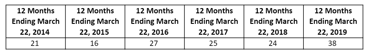 Companies publicly subjected to activist takeover attempts in the 12-months ending March 22, each year, globally.