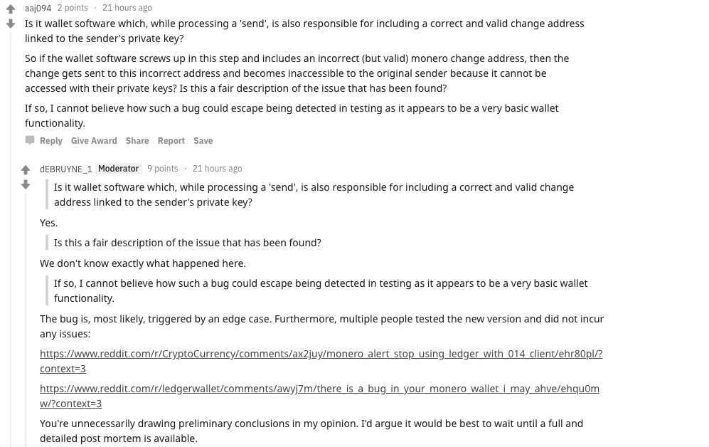 Monero developer clarifying queries pertaining to the bug | Source: Reddit