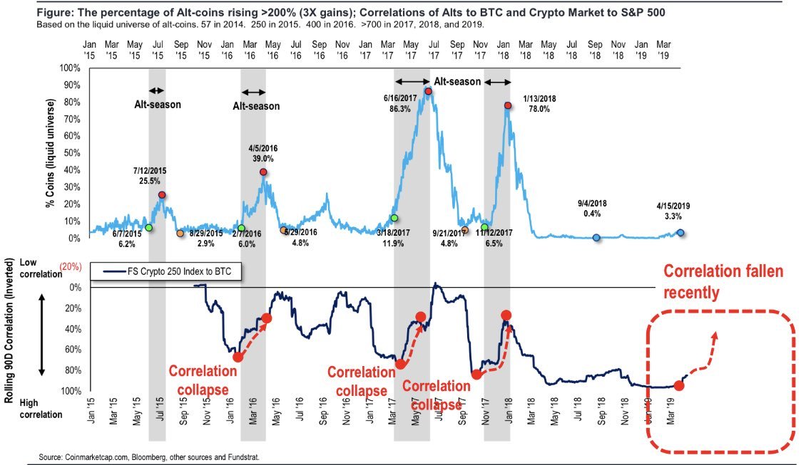 On the chart above, Lee marked the correlation collapse from March 2016 to May 2016, March 2017 to May 2017, November 2017 to January 2018, and the current trend seemed to form from March 2019.