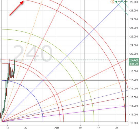 This chart looks delightful. Pricetime has only just crossed the 1st arc pair. The 3rd arc pair is a good first target at $26, but it would not surprise me at all if it went to the 5th pair, at ~$36
