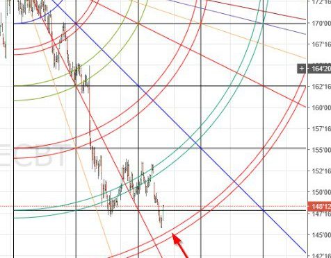 US Treasury Bonds are arguably the most traded contract on the planet. With all the talk about interest rate hikes in the news, I decided to take a look at the chart to see what the reason was that such talk was in the air. As you can see, bonds are very near the 5th arc on a daily chart. Either the low is already in, or there is just one more push down remaining.