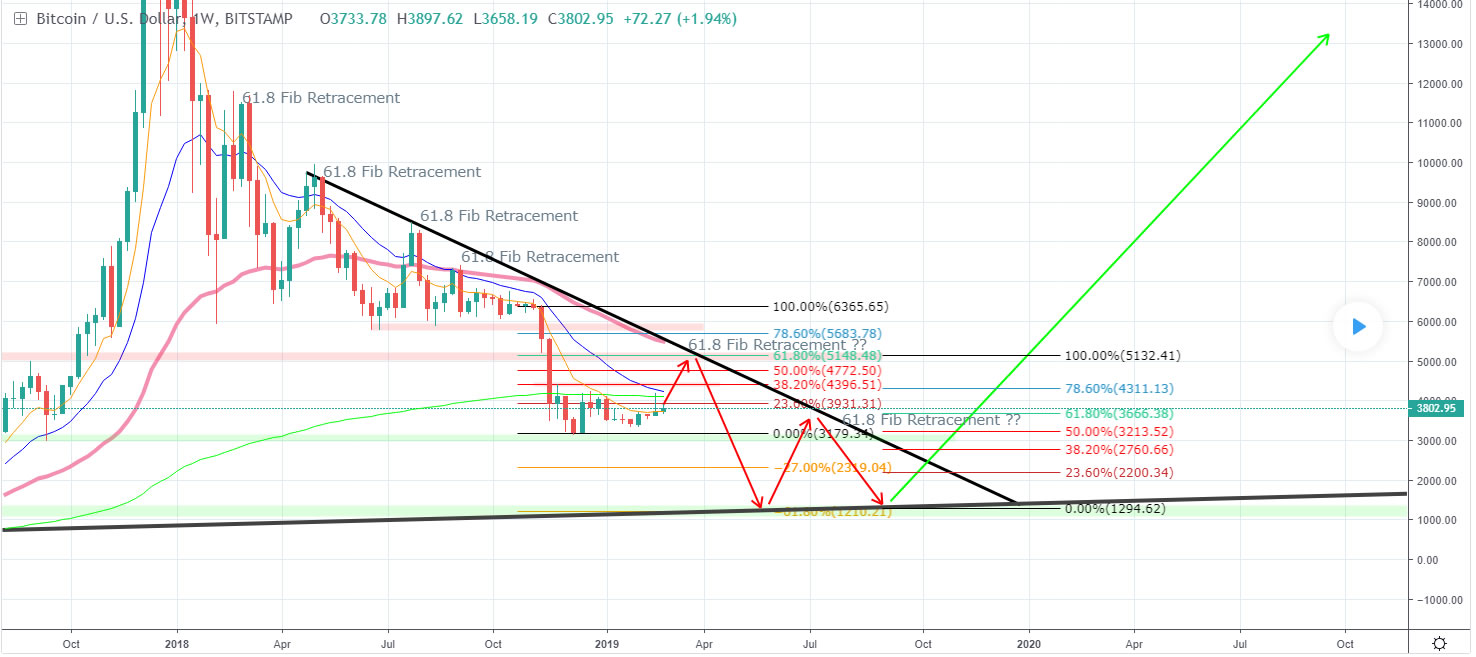 Other traders have predicted a longer term recovery, possibly by the end of 2019. Using the key long term 61.8 Fib retracement level could bounce off this at $5,000 only to according to this rather extreme scenario.