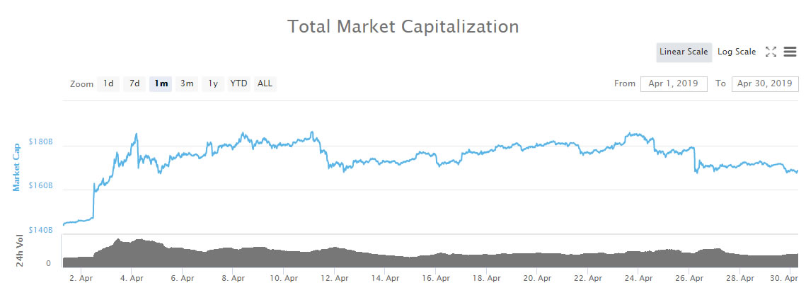 bitcoin was the driving force in April as it broke long term resistance and pumped past $5,000 to record a new 2019 high. Total market cap ended the month at $168 billion but peaked at a 2019 high of $186 billion on the 11th. Daily volumes have also been huge topping out at $88 billion during the initial surge.