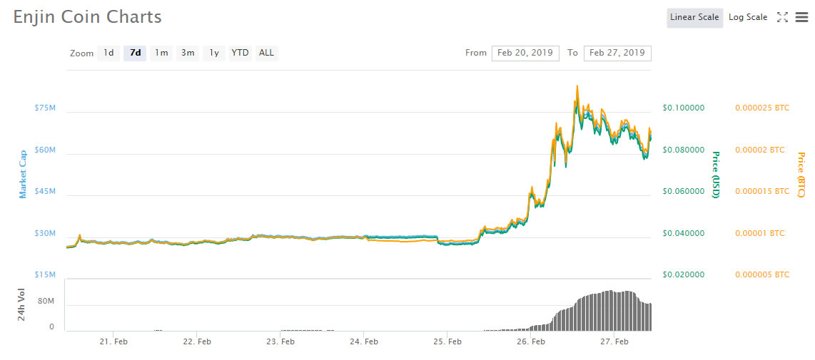 The move has pushed Enjin Coin up the market cap charts to 60th spot with a cap of $66 million. Binance currently has the majority of trade volume at over 60%. Unsurprisingly Korean exchanges Bithumb and Upbit are also up there with 25% of the total between them.