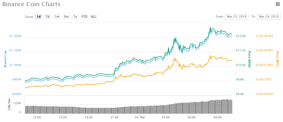 BNB has a current market capacity of $1.2 billion, there are 197 million total supply with 99 million circulating on the exchange. Trade volume for the past 24 hours has increased to $192 million or 21,665 BTC.