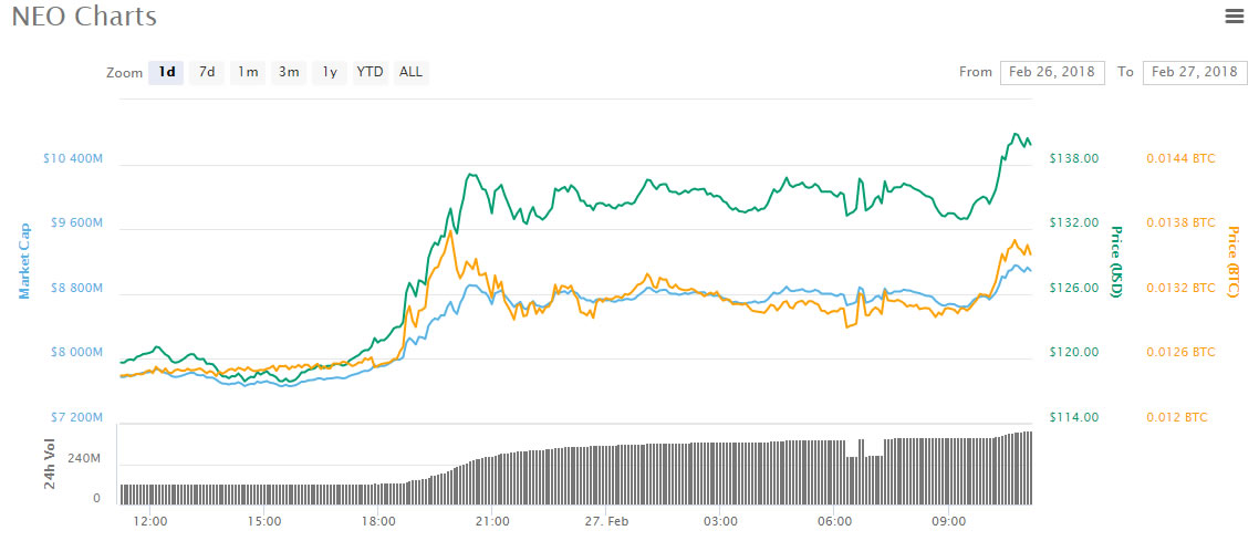 Coinmarketcap has Neo trading at 17% higher than this time yesterday. It is a fraction over $140 from $119 this time yesterday which is quite a significant price jump. Looking at the seven day chart Neo has rebounded back to its price this time a week ago, and over a month it is up marginally but still a way to go to reach its monthly high of $168 on January 30.