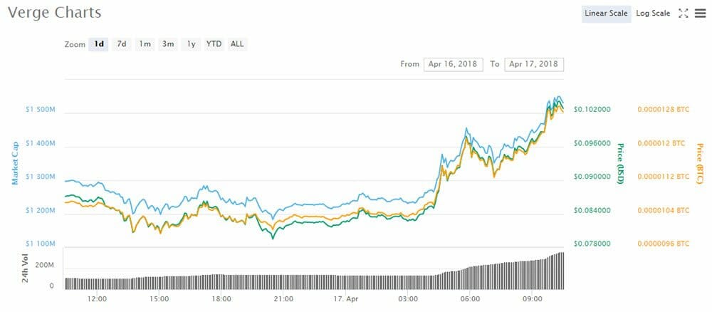 According to Coinmarketcap XVG went off like a rocket a few hours ago and is currently trading 18% higher on the day. Verge is currently trading at $0.10 from $0.084 this time yesterday, over the week it has posted solid gains rising around 20% in the seven day period. On the monthly chart XVG has jumped over 200% from $0.032 this time last month. Against bitcoin Verge has climbed over 20% to 1278 satoshis from 1067 sats this time yesterday. Weekly gains have been pretty slim however as Verge traded around the 1220 satoshi level this time last week.
