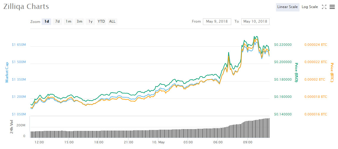 Currently the action is happening on Binance which has almost 70% of the total trade volume. That volume has risen over 200% from $120 million to $365 million over the past 24 hours. Zilliqa has surged into the top 25 by market cap with $1.5 billion which ranks it at 22nd, above Lisk, Verge, and Nano.