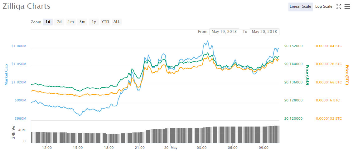 Coinmarketcap is currently reporting an 8% gain on ZIL which has pumped and dumped over the past week or so. Trading at $0.146 Zilliqa is up from $0.135 this time yesterday. Over the week however ZIL has lost 15% from $0.174 the same time last Sunday. When a number of announced listings it pumped to an all-time high of $0.23 on May ten but has fallen back ever since. Against bitcoin ZIL is up 8.5% on the day to 1785 satoshis from 1650 sats this time yesterday. Over the week though it has declined 14.6% against BTC from 2090 satoshis on Sunday last week.