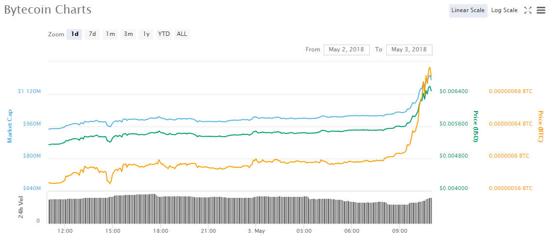 The revamped Coinmarketcap website is reporting a 24% jump in BCN which has nudged Zcash out of the top 25 this morning. Currently trading at $0.0064 this relatively unknown altcoin has spiked from $0.0051 this time yesterday. The pump started a couple of hours ago and this crypto is now on the move. Over the week Bytecoin is up 30% mostly due to this morning’s spike. Monthly gains are an impressive 190% from $0.0022 this time last month. Against bitcoin this newcomer to the top 25 has made 22% on the day at 70 satoshis and 25% on the week from 56 sats this time last Thursday.