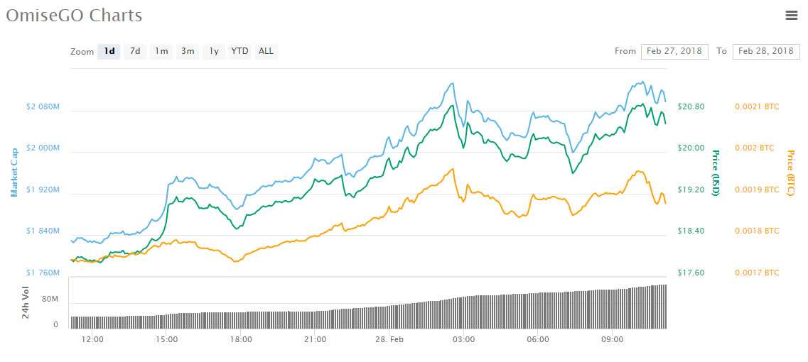 According to Coinmarketcap OMG is up 15% today from the same time yesterday, it is currently trading at $20.55 from $17.80 24 hours ago. It has made solid gains over the past seven days of 18% and is still trending upwards. OmiseGO has been one of the top performing cryptocurrencies during the month of February when most others have lost value. During the big early January spike it reached a peak of $27 and fell to $7.6 a month later in the big dip of February 6.