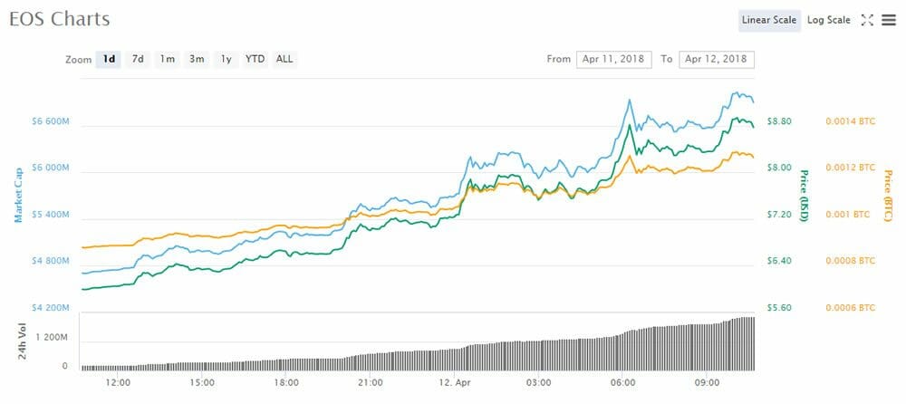 EOS has surged 45% according to Coinmarketcap and has supplanted Litecoin for fifth place in the charts. Trading this time yesterday at around $6, this altcoin is up to $8.80 today. Over the week EOS has been pretty flat ranging around the $5.80 mark, that is until it started to pump around 20 hours ago. The monthly picture shows a similar gain of around 45% as EOS has been trading around the $6 area for the past four weeks. This latest spike is responsible for all of its gains. Against bitcoin EOS is up 45% on the day to 127000 satoshis from 87800 sats this time yesterday. Monthly gains against BTC are a lot higher as EOS has doubled from 63000 satoshis this time last month.