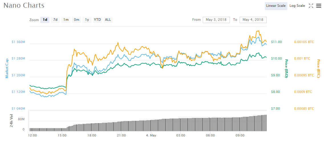 According to Coinmarketcap Nano is trading 21% higher on the day. It is the only altcoin in the top 25 with double digit gains at the moment. Currently trading at $10.2 Nano has made gains from $8.45 where it was this time yesterday. Over the week this altcoin has made gains of 40% from $7.28 this time last Friday. Nano has been a solid performer over the past month almost doubling in price from $5.2 this time last month. Against bitcoin Nano has made a 16% gain on the day to 105500 satoshis from 91000 sats this time yesterday. Weekly gains on BTC have been an impressive 33% from 79000 satoshis this time last week.