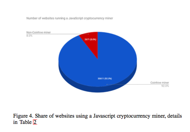 Using the search engine PublicWWW, the report found that over 30,000 websites currently use the Coinhive script, representing 92% of all websites running JavaScript cryptocurrency mining scripts.