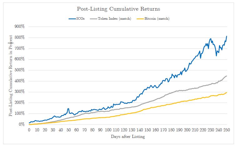 The study found that the average ICO token rose 179 percent from its token sale price to its opening price after achieving listing on a cryptocurrency exchange, a holding period that lasted an average of just 16 days. Even after assuming that tokens that failed to achieve listing within 60 days represent total losses for buyers, the average investor managed to net an 82 percent profit against USD.