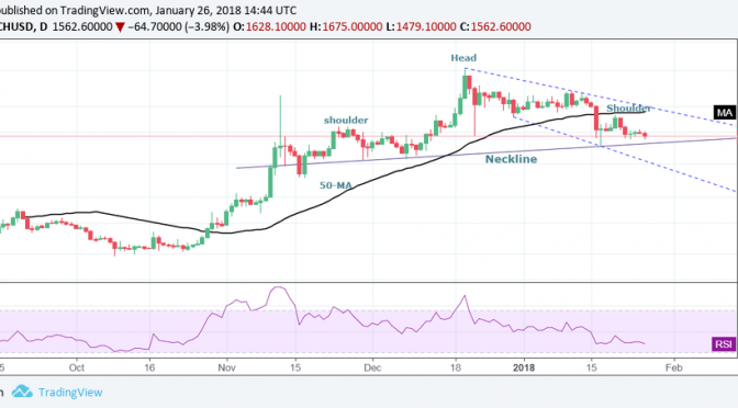 The development follows a sharp recovery from the Jan. 17 low of $1,343, which witnessed a follow-through buying in the subsequent days. However, the move ran out of steam at a high of $2,110 on Jan. 20 and BCH turned lower again, thus creating a lower high pattern (bearish pattern) on the charts.
