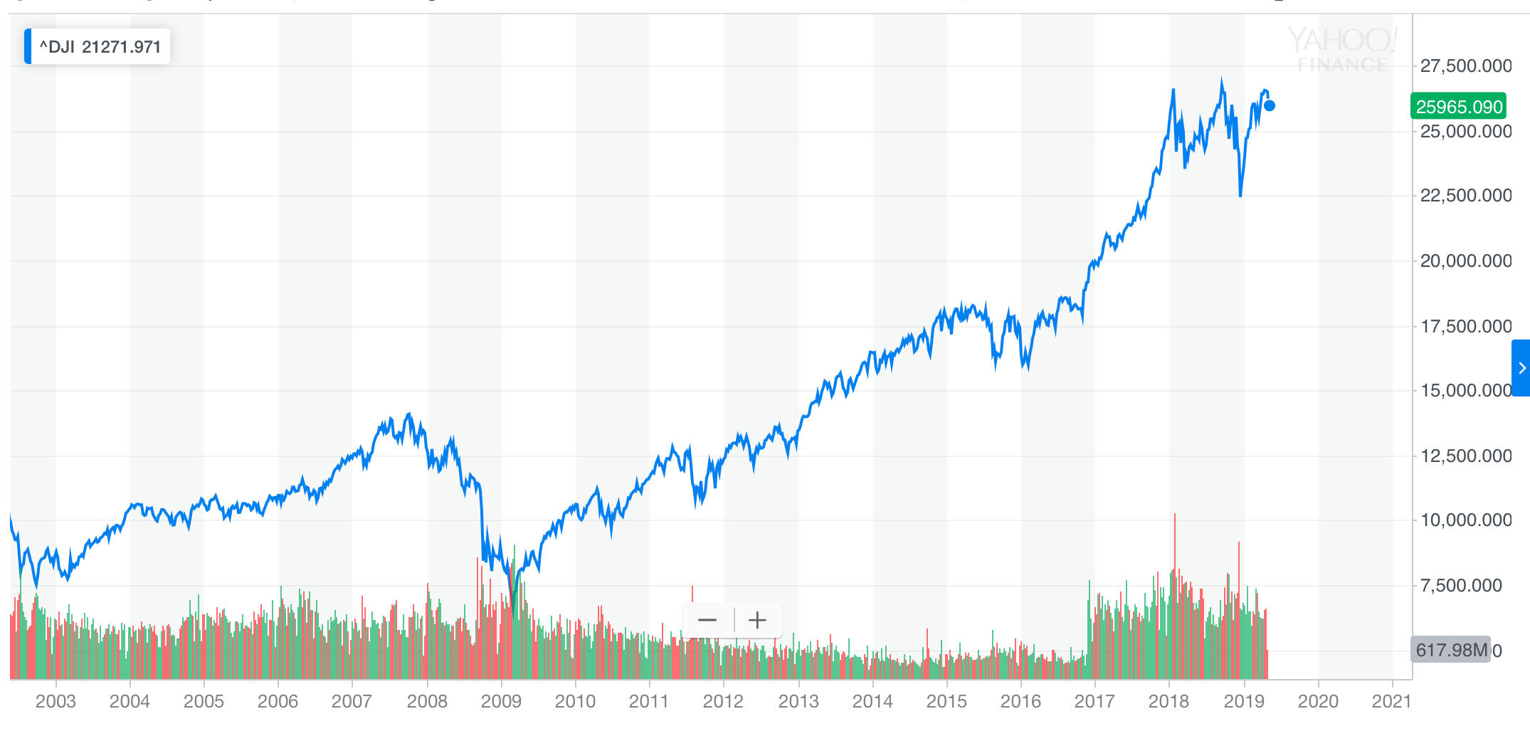 The Dow Jones follows a clear ten-year trajectory, irrespective of Trump’s policies. Source: Yahoo Finance