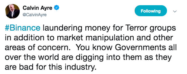 Calvin Ayre, the founder of Ayre group and a massive BSV proponent has called out the Changpeng Zhao-led exchange for “laundering money for terror groups” as well as “market manipulation”. He added that this accusation was not solely driven by him as, in his opinion, “governments all over the world” were also looking into Binance as they were “bad for the industry”.