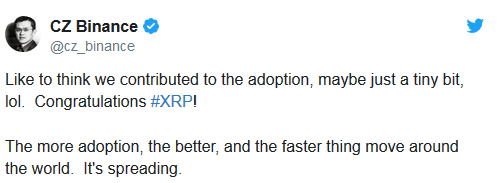 After XRP was listed on Coinbase, CZ took to Twitter to congratulate XRP users.