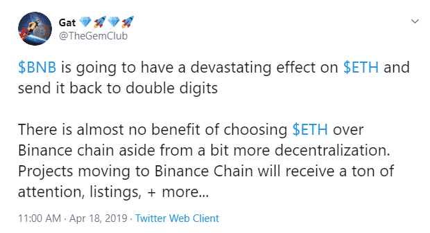Twitter user @TheGemClub tweeted on the situation, stating that Binance was going to outperform Ethereum in the industry now and the shift would cause Ethereum to undergo massive devaluation.