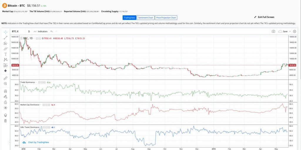 “Since January 1st 2018, bitcoin has grown from 41.8% to 56.7% of overall crypto market cap. Over that same time period #BTC has seen its share of total cryptocurrency tweets increase from 39.4% to 48.1%. Interestingly though, bitcoin has seen its share of overall cryptocurrency trading decrease from 48.8% to 32.5%”