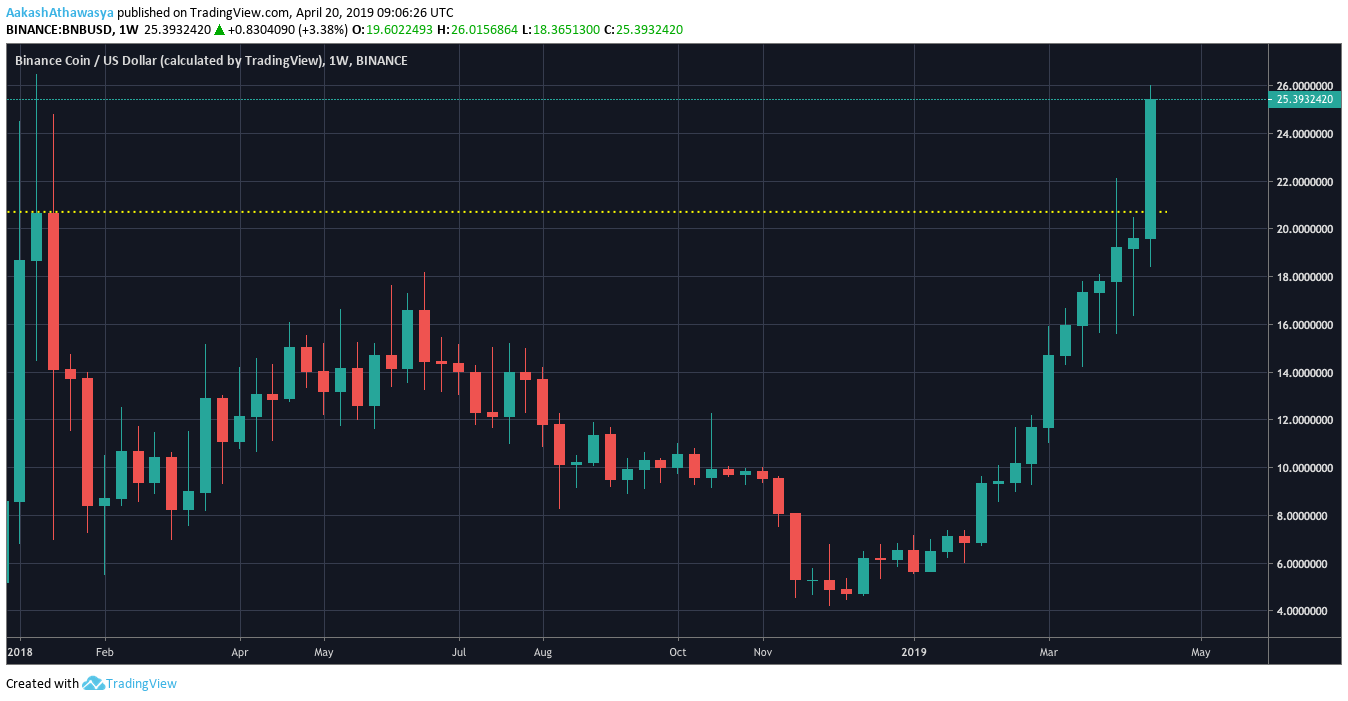 A slew of announcements emerging from Binance greatly added to the coin being the first mid-large cap cryptocurrency to break its all-time high [ATH] of $24.46 recorded on 12 January 2018. BNB broke this ceiling at 0400 UTC on April 20.