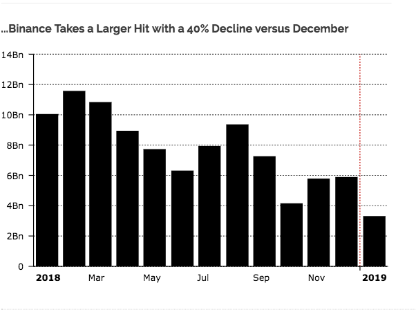 The American exchange, Coinbase has seen its trading volume tank consistently since 2018 started, owing to the bear market. In January, 2018, the exchange boasted a BTC/USD trading volume of $8.2 billion which soon fell to under $2 billion by December. The trading volume fell further to $1 billion in January, 2019, its worst point since 2017.