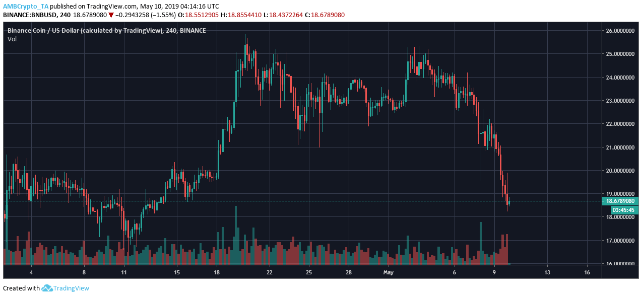 The price of Binance coin at press time was $18 and it had a market cap of $2.06 billion. Over 24 hours, the price collapsed by approximately 11%, whereas over 7 days the price had collapsed by ~22%.
