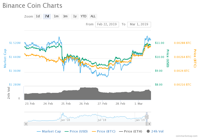 The pair is currently trading at a bid rate of 10.97, while its market capitalization is hovering around $1.57 billion. Meanwhile, the BNB’s bullish performance prompted Binance to beat bitcoin SV and Cardano to claim the 10th largest coin position.