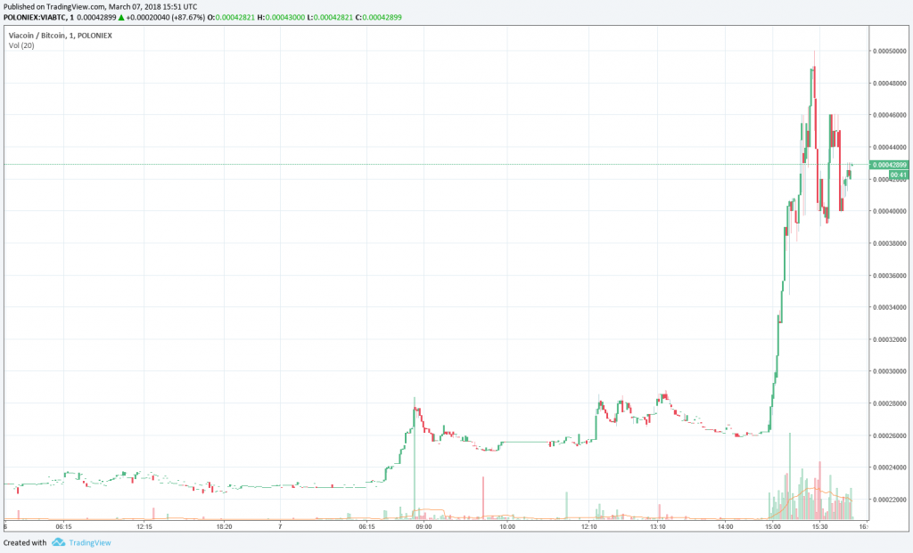 Indeed, Binance exchange data indicates that a ~325,000 VIA buy order placed shortly before 3 pm UTC increased the price of VIA/BTC by several hundred percent.