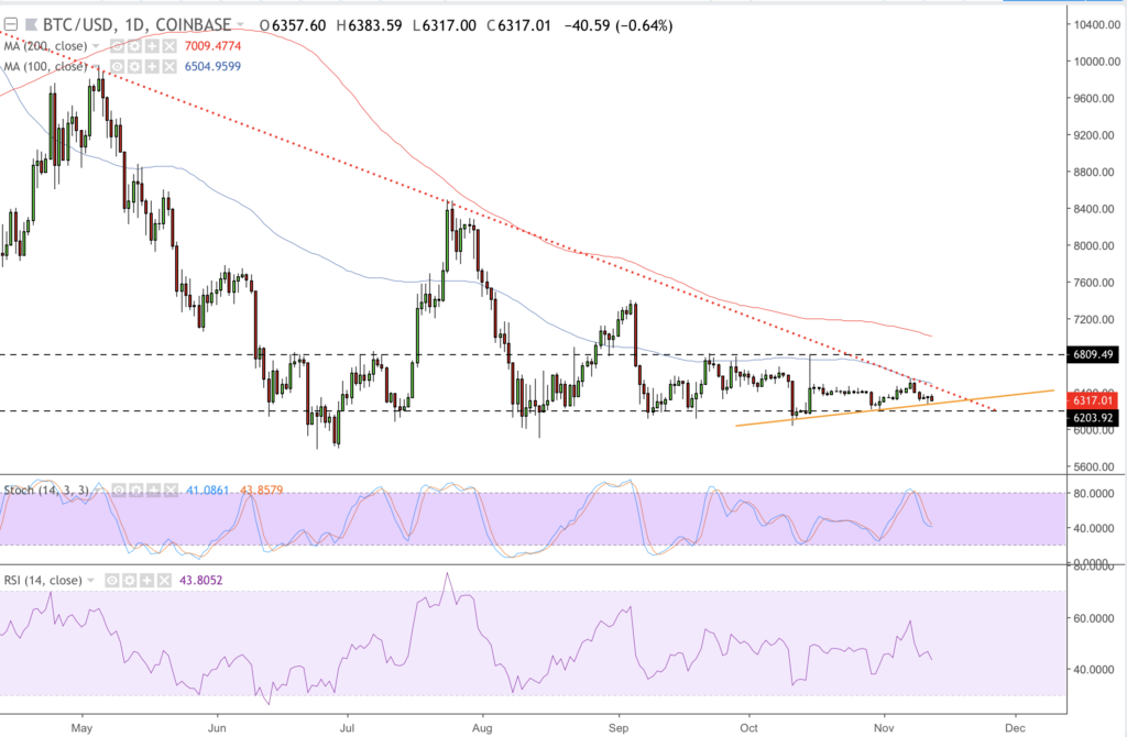 As of now, the RSI and Stochastic on daily charts are looking to post more losses. There is a bullish trendline forming in near-term as depicted in orange in the chart above. Bears could look to attempt a small breakdown action after breaking it to the downside, only to retest 6204-fiat as support. At the said level, the market could see more long actions, pushing the BTC/USD back towards the 100-period SMA – which is coinciding with the giant descending trendline these days.