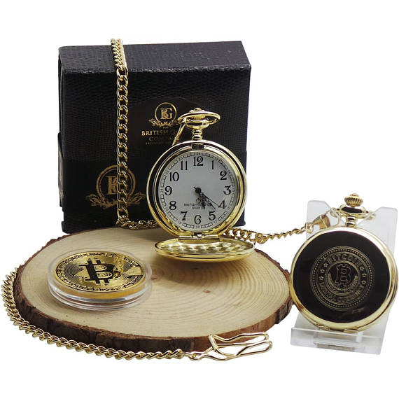 AND 24k Gold Plated Pocket Watch in Luxury box with Certificate Full Hunter & chain Engraved Virtual Digital Currency Gifts Business