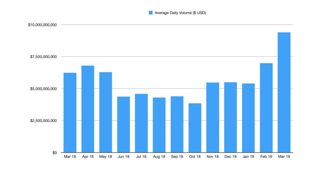 “bitcoin’s daily exchange volume is booming,” noted Rooke. “Volume has increased [approximately] 150 percent in the last five months. Average daily volume hasn’t been this high since January 2018. Only 9 days in the last [twelve] months had $10 billion-plus in volume – five of those days have been in March 2019.”